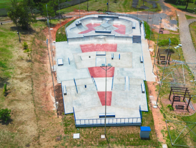 A nova pista de skate recém-inaugurada no Parque Centenário, localizada nas proximidades da Rua Ibiá, 31, no bairro Centenário em Montenegro-RS, é um equipamento moderno e de alto nível. O espaço é amplo, com piso de concreto bem acabado e obstáculos de street variados, como corrimãos, caixotes, bordas, planos inclinados e transições suaves, permitindo linhas criativas e técnicas para skatistas iniciantes e experientes. Inserida dentro do Parque Centenário, a pista está cercada por áreas verdes bem cuidadas, trilhas para caminhada e corrida, academia ao ar livre, bancos e espaços de convivência, o que garante fluxo constante de pessoas e um ambiente seguro e agradável. O entorno é predominantemente residencial, com fácil acesso, boa iluminação e clima familiar, tornando o local um ponto de encontro esportivo e social que fortalece a cena do skate na cidade e integra o esporte ao lazer urbano.