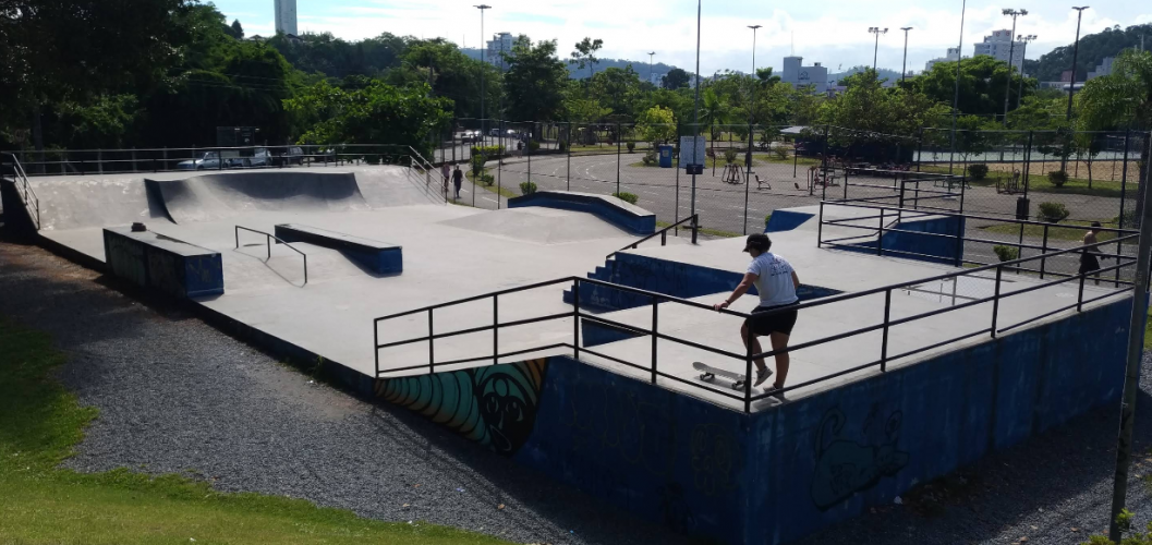 A pista de skate do Parque Ramiro Ruediger, localizada no bairro Velha em Blumenau (SC), fica dentro do maior parque público da cidade, um espaço de cerca de 40 mil m² bastante frequentado para esporte e lazer. A pista é de concreto e foi reformada para melhorar a segurança e a qualidade do piso, sendo utilizada por skatistas, patinadores e ciclistas. O skatepark possui obstáculos variados típicos de street e transições, com rampas inclinadas, planos e áreas para manobras, integradas a um espaço aberto e arborizado. Ao redor da pista há grande área de gramado, lago com deck, pista de corrida de aproximadamente 700 metros, quadras esportivas, playground e locais para descanso. O ambiente é movimentado, com famílias, atletas e visitantes circulando ao longo do dia, criando um cenário urbano-esportivo dentro de um parque bem cuidado e cercado por árvores.