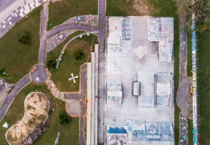 A pista de skate situada no bairro Vila Santa Terezinha, em Almirante Tamandaré (PR) assenta-se em um espaço público de concreto plano, bem integrado à malha urbana residencial de densidade média. O piso aparenta ser bem nivelado, propício a sessões de street com bancos, bordas e pequenas elevações, permitindo manobras de flat e transição leve.