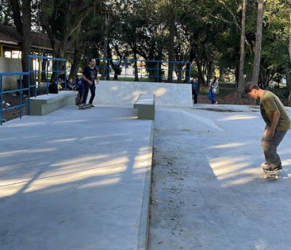 A pista de skate localizada na Rua Gen. Flores 85, no município de Agudo (RS), apresenta-se como um espaço aberto ao ar livre, com piso predominantemente de concreto liso, próprio para manobras de street e transição média, cercado por vegetação de mata nativa típica da região central do Rio Grande do Sul. O local situa-se em uma zona de baixa densidade urbana, com casas residenciais, alguns trechos gramados e poucas construções altas — o que garante boa ventilação, iluminação natural e uma atmosfera tranquila para treinar com foco. As rampas aparentam ter bordas metálicas e corrimãos simples, integrando-se à topografia ligeiramente inclinada do terreno, o que permite linhas de descida suaves para ganhar velocidade. No entorno imediato há árvores de pequeno a médio porte que fornecem sombra parcial — ideal para pausas — e um passeio de calçamento simples ao redor, embora sem cobertura ou vestiário visível, o que sugere que o skatista leve água e proteção solar. A rua de acesso é asfaltada, com fluxo moderado de veículos, e há pequenas áreas de estacionamento informal ou acostamento nas proximidades.