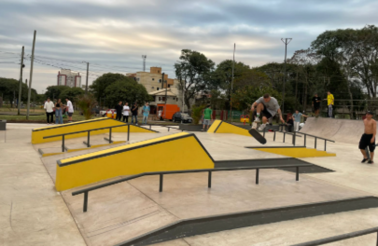 A pista de skate localizada na Avenida Tiaraju 810-924, na zona leste de Alegrete (RS), apresenta uma estrutura moderna em concreto claro com diversos obstáculos urbanos: banks, rampas leves, corrimãos baixos e ledges que facilitam o street-style e manobras criativas. As bordas metálicas dos obstáculos foram projetadas para dar fluidez à linha de skate e suportar desgaste das rodas, enquanto o piso amplo, com área de manobra livre, permite boas arrancadas e troca de direção. O entorno imediato da pista conta com iluminação pública e árvores de médio porte que fornecem sombra parcial — ideal para pausas — e bancos de alvenaria próximos para descanso ou espectadores. A pista está integrada a um lote público amplo, cercado por passeio asfaltado e vegetação rasteira em volta, bem como acesso fácil por via asfaltada diretamente pela avenida. Nas redondezas observam-se prédios residenciais baixos, comércio local modesto e estacionamento informal ao longo da via, o que garante visibilidade transitória e segurança para sessões à tarde.