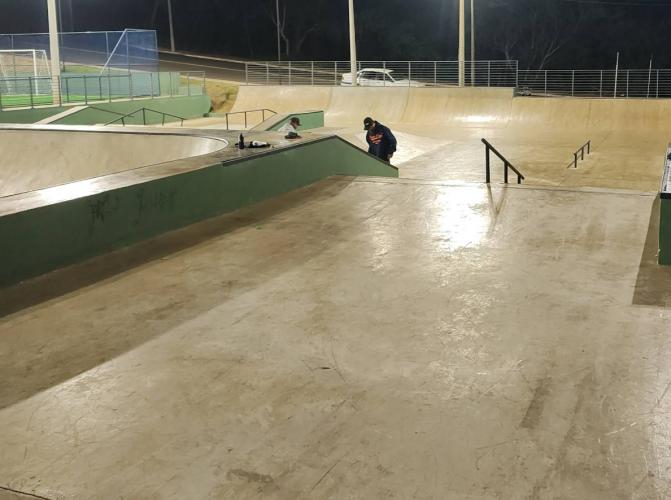 A pista de skate “Lava Pés” situada no Conjunto Habitacional Roque Ortiz Filho está inserida em área residencial consolidada, com casas de alvenaria simples a médias, ruas asfaltadas, calçadas com árvores jovens ao longo delas. O espaço de skate aparenta ter piso de concreto, provavelmente plano, voltado ao rolê de street, com obstáculos básicos: caixotes ou bancadas baixas para slide/grind, possivelmente corrimãos ou bordas; nada que pareça muito vertical ou rampas grandes, mais focado em manobras urbanas recreativas.