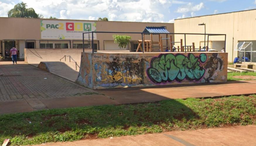 A pista de skate fica numa praça pública de porte médio no bairro Céu Azul, inserida em área urbana residencial. O piso provavelmente é de concreto, relativamente plano, voltado para street skate, com obstáculos básicos — caixotes, bancos elevados ou bordas, possivelmente corrimões simples — adequados tanto para iniciantes quanto para rolês recreativos mais leves. Ela se abre em espaço ao ar livre, sem cobertura significativa, então exposta ao sol forte do dia e à chuva; sombras devem vir das árvores da praça e das residências próximas. A iluminação pública das ruas adjacentes alcança parte do local, embora não se saiba se há refletores específicos para a pista.