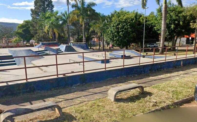 A Praça do Skate situa-se numa via residencial relativamente central, na Rua Murici, entre imóveis modestos a médios, com calçadas simples de cimento ou laje, algumas árvores espaçadas proporcionando sombra parcial ao longo das laterais. O solo da praça tem seções de piso de concreto para skate, provavelmente com caixas ou plataformas baixas e possivelmente corrimãos ou rampas leves para manobras de “street”; não aparenta haver bowl profundo ou rampas verticais, mas sim obstáculos acessíveis, voltados para uso comunitário e recreativo. O rodeio de obstáculos é espaçado o bastante para permitir rolês de transição lenta entre eles, embora possa haver desníveis no piso ou juntas de dilatação perceptíveis, como ocorre em espaços públicos similares.